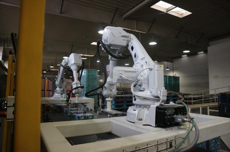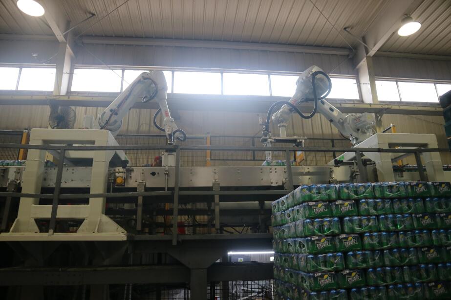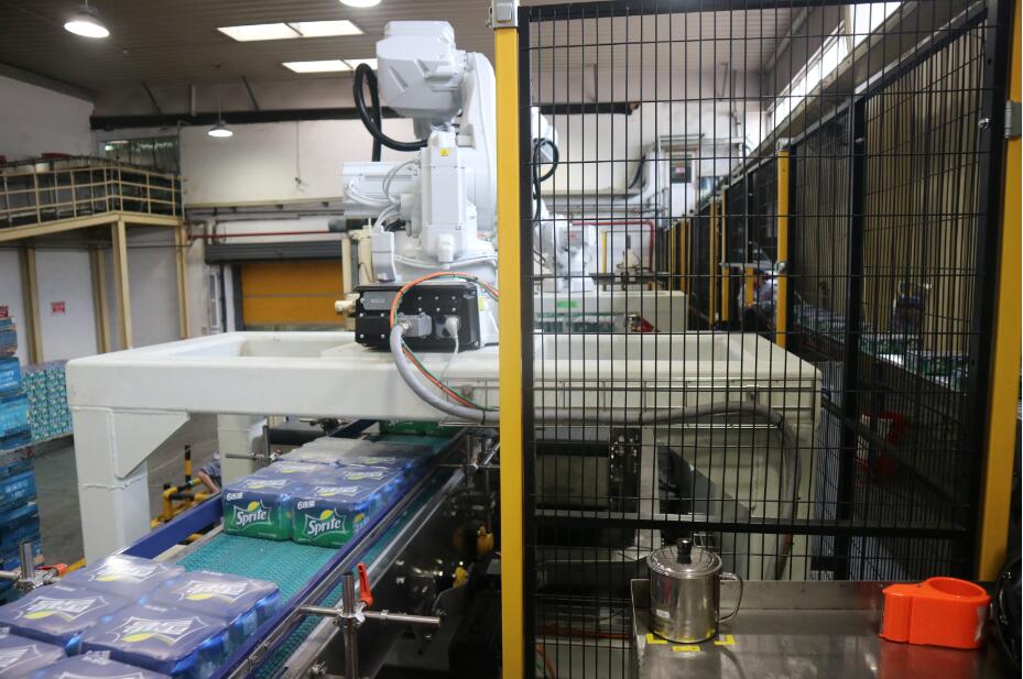此设备是南京九洲官方网站-九洲jiuzhou(中国)根据客户的实际需求进行定制的,满足现有普罐9箱、10箱花型、SLEEK CAN、MINI SLEEK CAN13箱花型码垛需求,并且具备未来2*6、3*4、3*5花型升级功能和生产能力,单台能力达到60箱/分钟。设备主体采用ABB智能机器手,通过 SEW伺服电机带动双向丝杆,来驱动固定在2根进口导轨上的夹板,对包型夹护后由机器人来进行位移分道,转向。设备运行稳定,高效,占用空间小,减少了对箱包的碰撞和磨损。